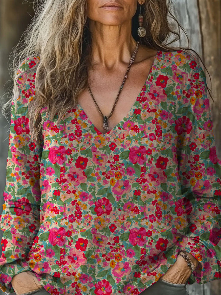 Women's Retro Pink Floral V-neck Long Sleeve Top